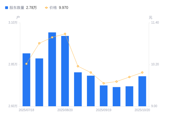 近一年(2024年10月31日至2025年10月20日),陇神戎发A股股东户数从3.05万户,减低至2.78万户,降幅8.79%,区间股价上涨8.84%。