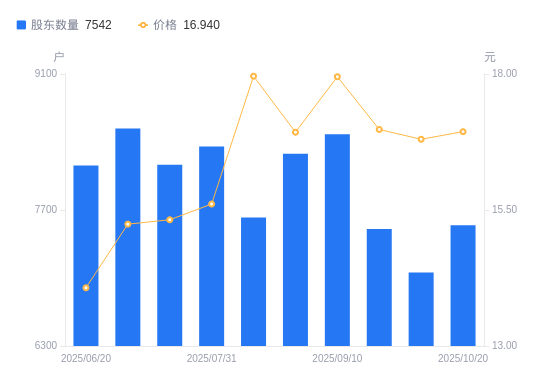 近一年(2024年10月31日至2025年10月20日),名雕股份A股股东户数从7937户,减低至7542户,降幅4.98%,区间股价上涨42.31%。