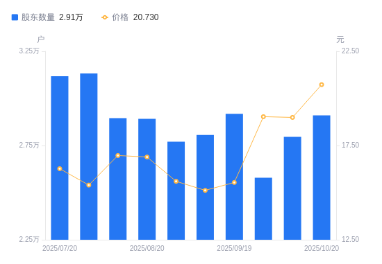 10月21日消息,数据显示,截至2025年10月10日,力星股份A股股东总户数为2.8万户,较上期(2025年9月30日)增加2163户,增幅8.39%。公司最新A股总股本为2.94亿股,其中流通A股2.3亿股,户均持有流通A股数量为8239.82股,较上期减少691.02股,降幅7.74%;户均持流通A股市值15.65万元,较上期减少1.35万元,降幅7.93%。