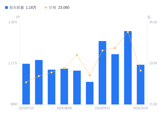 近一年(2024年10月31日至2025年10月20日),中瑞股份A股股东户数从1.25万户,减低至1.16万户,降幅7.15%,区间股价下跌7.83%。