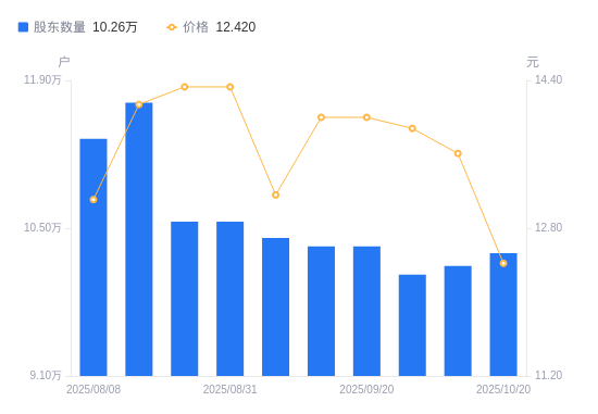 近一年(2024年10月31日至2025年10月20日),广电运通A股股东户数从11.28万户,减低至10.26万户,降幅9.05%,区间股价上涨0.00%。