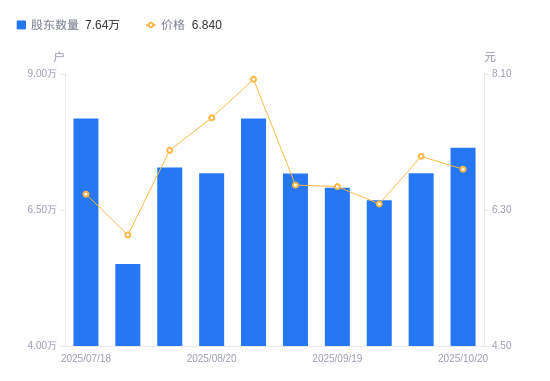 近一年(2024年10月31日至2025年10月20日),三川智慧A股股东户数从3.37万户,增加至7.64万户,增幅126.49%,区间股价上涨60.19%。