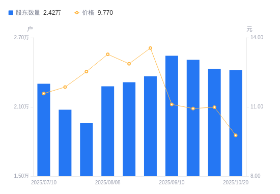 近一年(2024年11月10日至2025年10月20日),美联新材A股股东户数从2.46万户,减低至2.42万户,降幅1.69%,区间股价上涨21.22%。