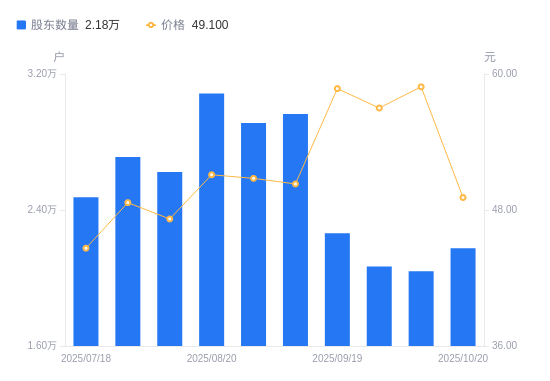 近一年(2024年10月31日至2025年10月20日),电连技术A股股东户数从1.75万户,增加至2.18万户,增幅23.97%,区间股价上涨9.26%。