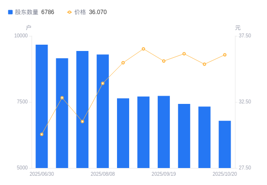 近一年(2024年10月31日至2025年10月20日),江苏博云A股股东户数从7366户,减低至6786户,降幅7.87%,区间股价上涨66.38%。