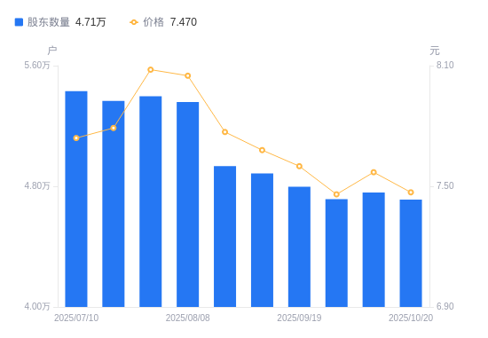 近一年(2024年11月8日至2025年10月20日),鲁北化工A股股东户数从5.41万户,减低至4.71万户,降幅12.88%,区间股价下跌10.11%。