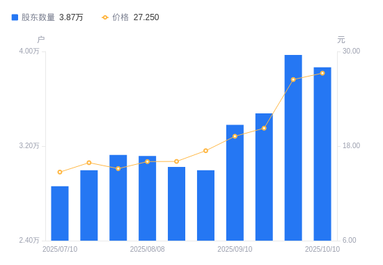 近一年(2024年10月10日至2025年10月10日),盛达资源A股股东户数从2.97万户,增加至3.87万户,增幅30.06%,区间股价上涨119.23%。