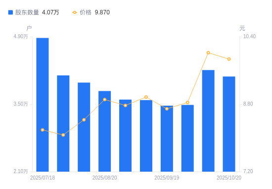 近一年(2024年11月20日至2025年10月20日),金岭矿业A股股东户数从3.42万户,增加至4.07万户,增幅19.21%,区间股价上涨59.19%。