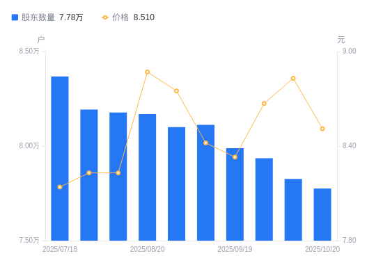 近一年(2024年10月31日至2025年10月20日),东北证券A股股东户数从9.73万户,减低至7.78万户,降幅20.07%,区间股价上涨8.13%。