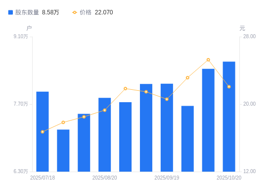 近一年(2024年10月31日至2025年10月20日),锡业股份A股股东户数从8.36万户,增加至8.58万户,增幅2.64%,区间股价上涨47.33%。