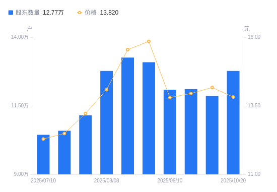 近一年(2024年10月31日至2025年10月20日),中科三环A股股东户数从10.15万户,增加至12.77万户,增幅25.77%,区间股价上涨38.76%。