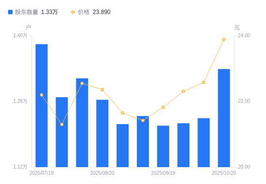 近一年(2024年11月20日至2025年10月20日),尤安设计A股股东户数从1.4万户,减低至1.33万户,降幅5.38%,区间股价上涨24.49%。