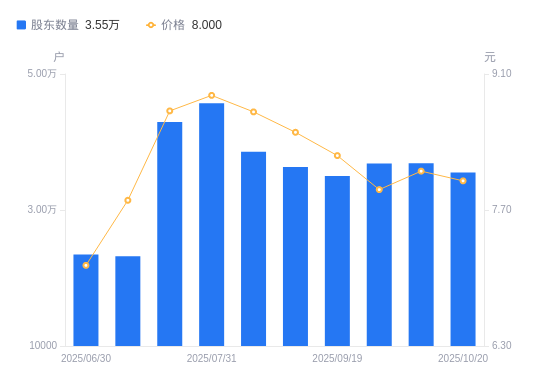 近一年(2024年11月20日至2025年10月20日),三和管桩A股股东户数从2.3万户,增加至3.55万户,增幅54.35%,区间股价上涨30.51%。