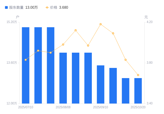 近一年(2024年12月10日至2025年10月20日),山东矿机A股股东户数从21万户,减低至13万户,降幅38.10%,区间股价下跌29.50%。