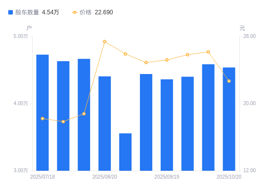近一年(2024年10月31日至2025年10月20日),博威合金A股股东户数从3.83万户,增加至4.54万户,增幅18.47%,区间股价上涨21.86%。