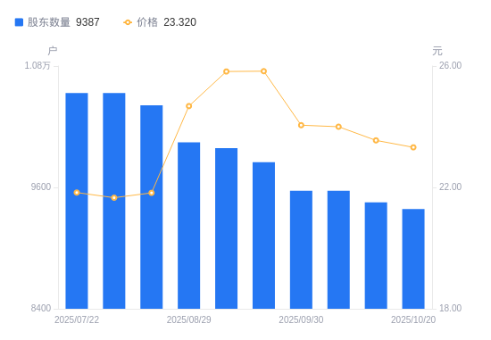 近一年(2024年12月31日至2025年10月20日),海川智能A股股东户数从8546户,增加至9387户,增幅9.84%,区间股价上涨28.41%。