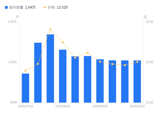 近一年(2024年10月31日至2025年10月20日),启迪设计A股股东户数从1.6万户,增加至1.64万户,增幅2.04%,区间股价上涨13.23%。