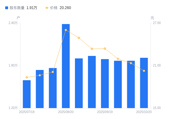 近一年(2024年11月8日至2025年10月20日),隆利科技A股股东户数从1.8万户,增加至1.91万户,增幅6.11%,区间股价上涨19.25%。