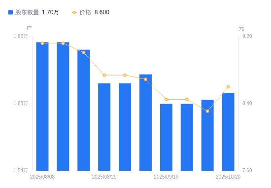 近一年(2024年11月29日至2025年10月20日),宿迁联盛A股股东户数从1.21万户,增加至1.7万户,增幅40.60%,区间股价上涨3.11%。