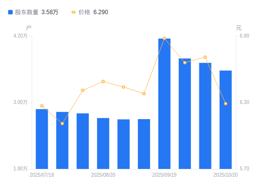 近一年(2024年11月8日至2025年10月20日),中汽股份A股股东户数从3.54万户,增加至3.58万户,增幅0.95%,区间股价下跌6.30%。