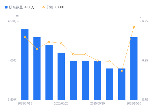 近一年(2024年10月31日至2025年10月20日),大连热电A股股东户数从5.7万户,减低至4.3万户,降幅24.56%,区间股价下跌19.71%。