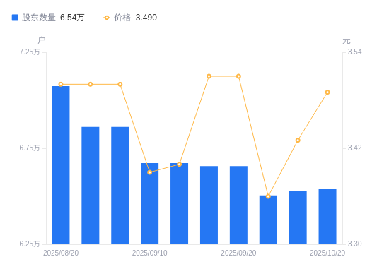近一年(2024年10月30日至2025年10月20日),淮河能源A股股东户数从3.45万户,增加至6.54万户,增幅89.60%,区间股价下跌11.42%。