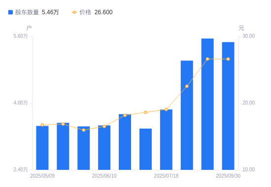 近一年(2024年9月30日至2025年9月30日),索通发展A股股东户数从3.41万户,增加至5.46万户,增幅60.17%,区间股价上涨131.89%。
