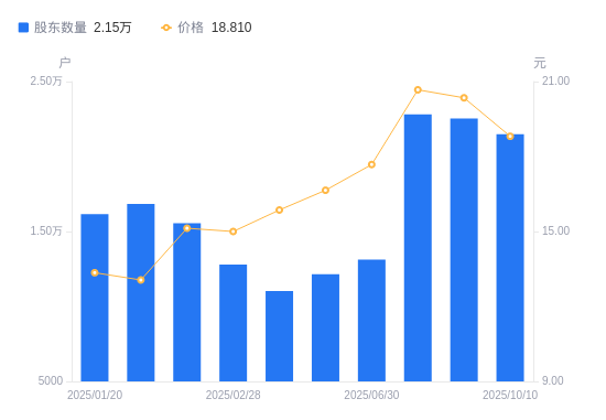 10月21日消息,数据显示,截至2025年10月10日,西菱动力A股股东总户数为2.15万户,较上期(2025年9月19日)减少1056户,降幅4.68%。公司最新A股总股本为3.06亿股,其中流通A股2.25亿股,户均持有流通A股数量为1.05万股,较上期增加491.49股,增幅4.91%;户均持流通A股市值19.74万元,较上期减少6157.43元,降幅3.03%。