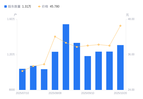 近一年(2024年11月20日至2025年10月20日),飞沃科技A股股东户数从1.07万户,增加至1.31万户,增幅22.42%,区间股价上涨57.54%。