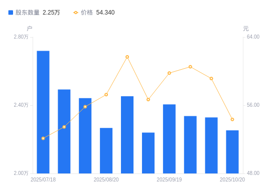 近一年(2024年10月31日至2025年10月20日),中瓷电子A股股东户数从2.31万户,减低至2.25万户,降幅2.35%,区间股价上涨8.18%。