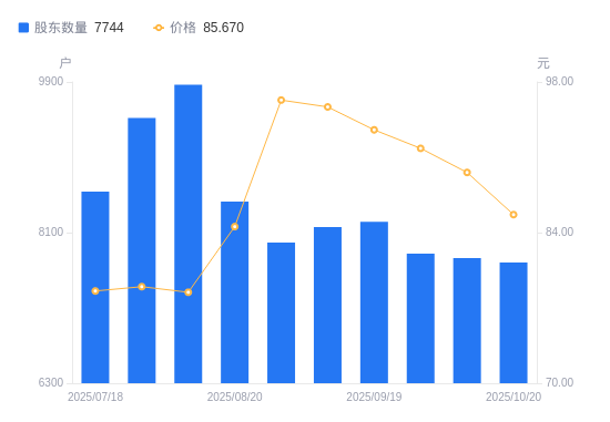 近一年(2024年10月31日至2025年10月20日),博实结A股股东户数从1.37万户,减低至7744户,降幅43.34%,区间股价上涨32.56%。