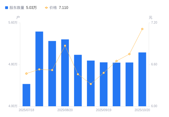 近一年(2024年10月20日至2025年10月20日),海德股份A股股东户数从3.92万户,增加至5.03万户,增幅28.33%,区间股价下跌0.84%。