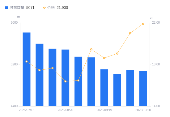 近一年(2024年10月31日至2025年10月20日),*ST和科A股股东户数从8118户,减低至5071户,降幅37.53%,区间股价上涨42.67%。