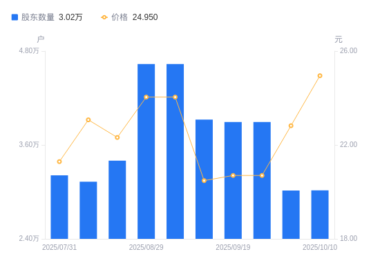 近一年(2024年10月18日至2025年10月10日),星网宇达A股股东户数从3.92万户,减低至3.02万户,降幅22.95%,区间股价上涨39.23%。