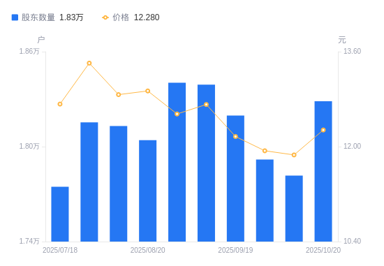 近一年(2024年10月31日至2025年10月20日),亨迪药业A股股东户数从2.19万户,减低至1.83万户,降幅16.42%,区间股价下跌14.19%。