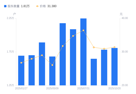 近一年(2024年11月29日至2025年10月20日),拓新药业A股股东户数从1.8万户,增加至1.81万户,增幅0.16%,区间股价下跌2.61%。