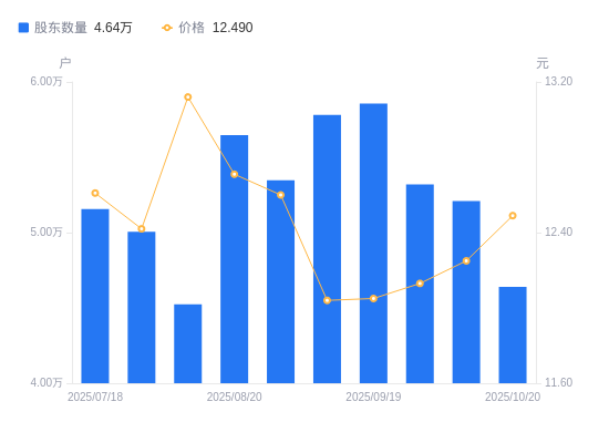近一年(2024年10月31日至2025年10月20日),燕京啤酒A股股东户数从5.98万户,减低至4.64万户,降幅22.37%,区间股价上涨26.29%。