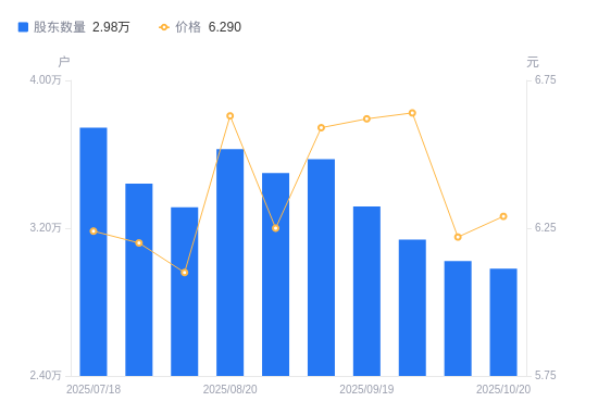 近一年(2024年10月31日至2025年10月20日),百纳千成A股股东户数从3.28万户,减低至2.98万户,降幅9.10%,区间股价上涨20.96%。