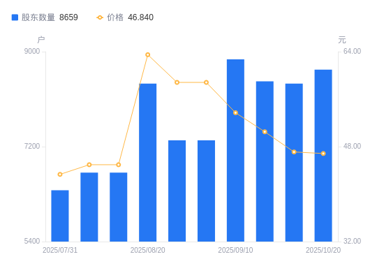 近一年(2024年12月31日至2025年10月20日),奇德新材A股股东户数从7666户,增加至8659户,增幅12.95%,区间股价上涨190.93%。