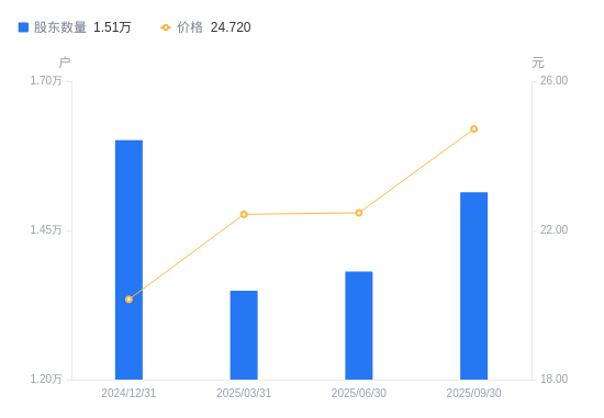 10月22日消息,数据显示,截至2025年9月30日,安科瑞A股股东总户数为1.51万户,较上期(2025年6月30日)增加1328户,增幅9.62%。公司最新A股总股本为2.51亿股,其中流通A股1.76亿股,户均持有流通A股数量为1.16万股,较上期减少1116.5股,降幅8.77%;户均持流通A股市值28.7万元,较上期增加1023.35元,增幅0.36%。