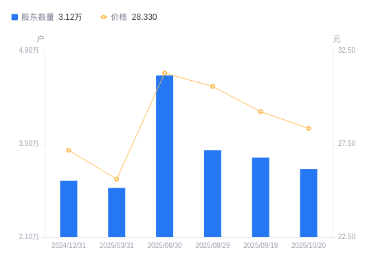 近一年(2024年12月31日至2025年10月20日),东方中科A股股东户数从2.95万户,增加至3.12万户,增幅5.89%,区间股价上涨0.01%。