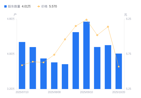 近一年(2024年11月20日至2025年10月20日),万顺新材A股股东户数从3.62万户,增加至4.01万户,增幅10.70%,区间股价下跌2.62%。