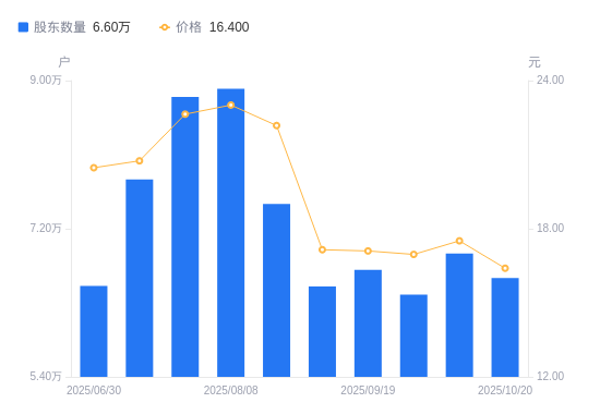 近一年(2024年10月22日至2025年10月20日),晨曦航空A股股东户数从3.9万户,增加至6.6万户,增幅69.23%,区间股价上涨44.88%。