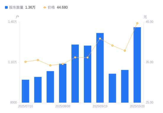 近一年(2024年11月8日至2025年10月20日),富特科技A股股东户数从1.45万户,减低至1.36万户,降幅6.22%,区间股价上涨50.90%。
