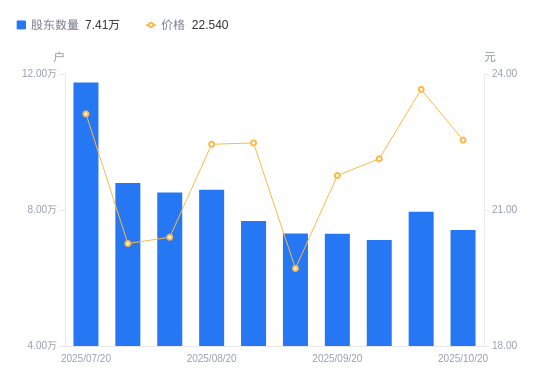 近一年(2024年10月31日至2025年10月20日),中电港A股股东户数从6.58万户,增加至7.41万户,增幅12.67%,区间股价上涨12.60%。