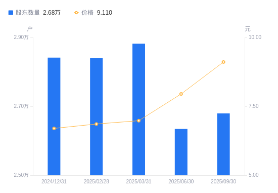近一年(2024年9月30日至2025年9月30日),中元股份A股股东户数从2.76万户,减低至2.68万户,降幅2.96%,区间股价上涨72.21%。