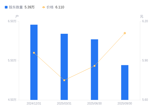 10月16日消息,数据显示,截至2025年9月30日,冰山冷热A股股东总户数为5.39万户,较上期(2025年6月30日)减少6552户,降幅10.84%。公司最新A股总股本为6.02亿股,其中流通A股6亿股,户均持有流通A股数量为1.11万股,较上期增加1208.1股,增幅12.16%;户均持流通A股市值6.81万元,较上期增加9864.48元,增幅16.95%。