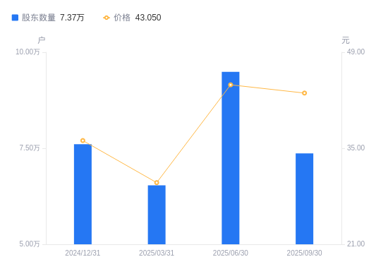 近一年(2024年9月30日至2025年9月30日),台基股份A股股东户数从5.52万户,增加至7.37万户,增幅33.49%,区间股价上涨149.06%。