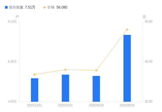 近一年(2024年9月30日至2025年9月30日),寒锐钴业A股股东户数从6.01万户,增加至7.51万户,增幅24.95%,区间股价上涨99.86%。