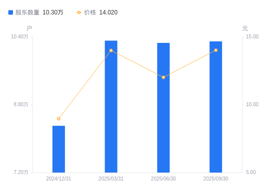 近一年(2024年9月30日至2025年9月30日),秦川机床A股股东户数从8.32万户,增加至10.3万户,增幅23.69%,区间股价上涨77.47%。
